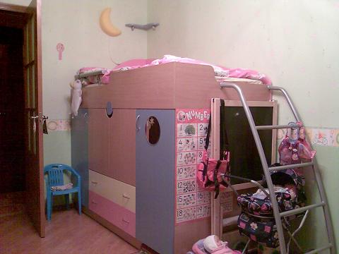 На первой кровать и встроенный в нее шкаф для одежды (что вешать на плечики, двери по бокам) и по середине наверху за дверцами две полки, внизу два ящика. Место под кроватью задействовано полностью, т.е. глубина шкафов, полок и ящиков равна 90 см. Над кроватью полочка ввиде голубого облачка и ночник.