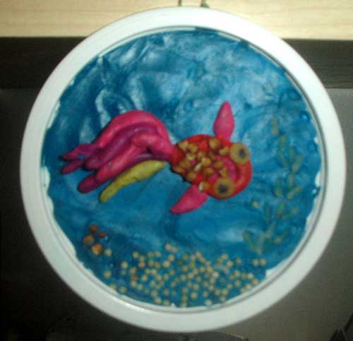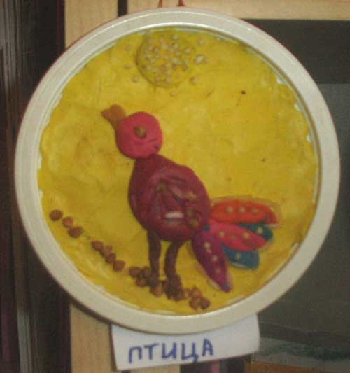 вот первая работа - 6 мес. съедобная))) 2-10 мес, 3- 1г 8 мес 4, 5 - 2г.3м по крышечкам от майонеза размазывался фон, потом отдельно делались детали и украшались крупой. 6- пока сидел сос мной на лекции, а за окном шел снег - рисовал машину) 2г5м |