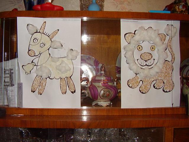 на 1-м фото две работы, сделанные с разницей в 3 недели. заготовка из раскрасок+вата+крупы(пшеничка, пшено, манка)+клей. мама работала подавальщицей, советчицей и корректором (что бы за контур не залезал- но это больше на словах конечно) Игорьку 1,10 |