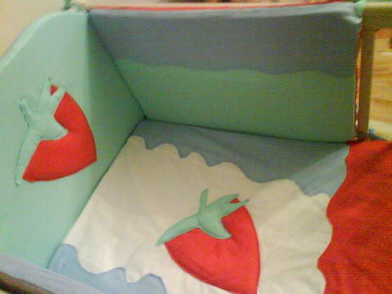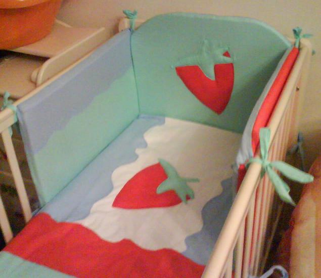 короче это борты, пододеяльник, одеяло на синтепоне внутри (тоже сама делала), и ещё 2 простынки на резинке - зелёненькая и голубенькая.... |
