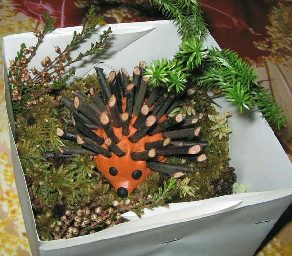 ![]() Ежик из пластики (типа пластилина хрень такая, которая при запекании в духовке превращается в пластмассу), иголки из березовых веточек. Коробочка из картона в ней мох и разные веточки. |