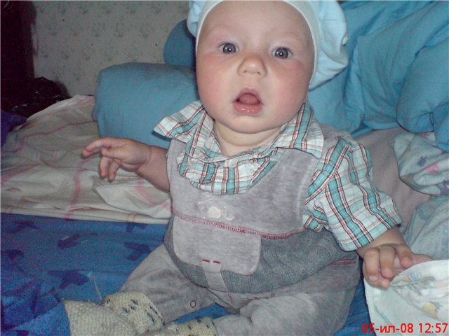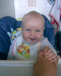 Какие все малыши хорошенькие! Просто красавцы и красавицы! А мы вчера были у педиатра, сейчас 72 см и 10500 гр. Сделали 3й гепатит. У нас вслед за предыдущими 2мя зубами через 3 дня прорезались еще 2 нижних, так что теперь 4 лезут Но вроде переживаем это хорошо...Вот мы какие - сидим ждем обеда ![]() |