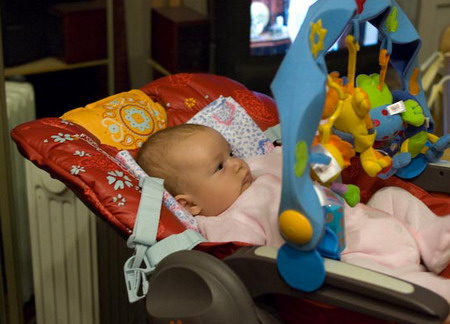 Девочки, смотрите - я фотку сделала в таком ракурсе, чтобы было видно угол наклона спинки у стульчика Chicco Poly. И Веронике там явно удобнее, чем в шезлонге
