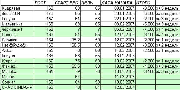 Решила отсортировать по результатам - очень даже красиво получилось - хороший стимул для новеньких Цветом выделены те, кто закончил уже с результатом и те, кто действительно продолжает хотя бы периодически отмечаетсяУ меня в питании разброд и шатания... Вчера в ленте сельдерей купить не удалось - там только ценник висел, а самой травки не было ;( Сегодня в ОК поплетусь вечером... |