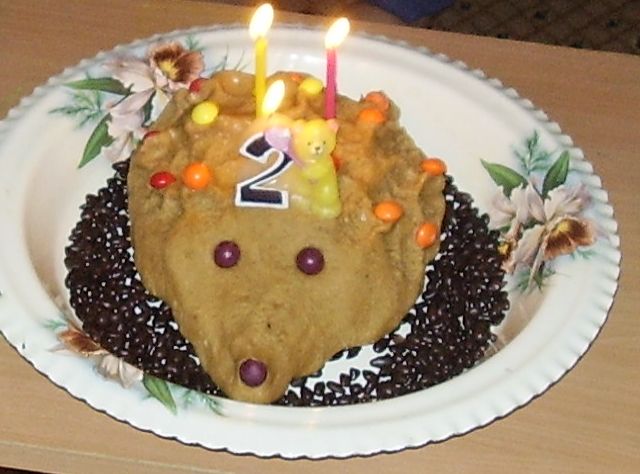 Папа слепил Виталику торт хотел сделать грузовик, но вышел ежик.Виталик от вспышки все время прятался, так что "приличных" фотографий так и не получилось... |