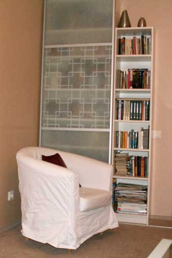 А это слеллаж не помню какизовут и кресло Тульста. Перед стеллажем раздвижные двери, не Икеевские они одновременно двери комнаты и дверцы стеллаажа
