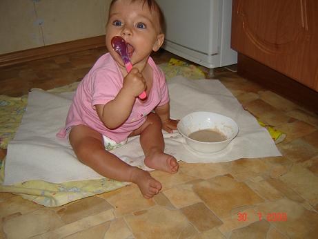 1. Софья с интересом наблюдала как играют и тоже решила попробовать. 2 и 3 Попробовала самостоятельно поесть кашу. Процесс увлекательный, но осталась голодной. |