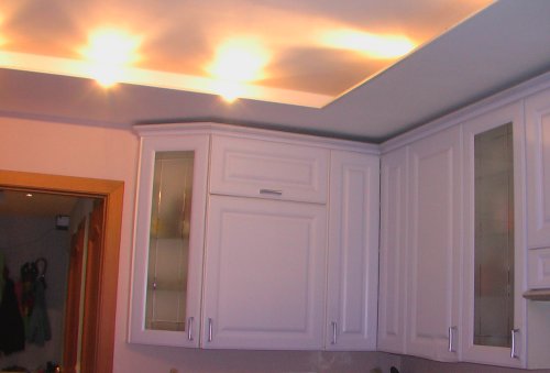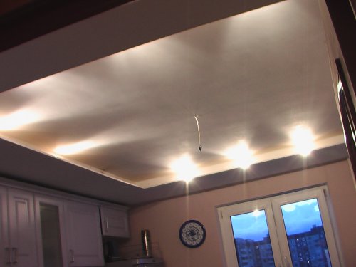 В общем, вот: потолок на кухне. Эта хрень в серединке свисает не в тему, там тока нет, в общем, пока не решили что там делать, как место украсить... Не пришли к единому мнению (есть идеи?) И коридорчик на кухню. |