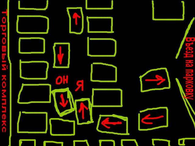 (((((Вообщем приехала я к себе на работу сёдня с полдня, к 13.30.... (С утра дела были ).... Полная парковка народу.... Движуха жуткая, как в муравейнике (у нас в субботу всегда так)..... Стала я заезжать, а мне навстречу стал мужик выезжать на тонированной машинке... Не заметила я его - увлеклась.... Вообщем прижалась к нему, кругом машины - узенько.... Что делать - не знаю.....Чувствую только, что исчо чуть-чуть - и долбану я его...... Я остановилась, т.к. между нами уже сантиметров 5 осталось.... Он тоже остановился, т.к. меня ему не объехать.... Я сижу - чуть не плачу... Что делать - не знаю...открыла окно.... Этот, из тонированной высунулся из окошка - говорит: "проедь вперёд"... А мне страшно.. Долбануть его боюсь... И туплю сижу.... В ступор короче впала... Сзади и за мной и за ним очередь из машин выстроилась..... Все сигналят, ругаются...А у входа в ТК куча народу стоят, кто курит, кто чего, половина меня знает... Стыдно... Слава Богу, подошёл ко мне мужчина, уже не молодой, и подсказал, чтобы я руль вывернула чуть-чуть вправо, и проехала чуть-чуть вперёд..... Я так и сделала... Спасибо этому дядечке огромное.... Благодаря ему всё обошлось... Вот, картинку с моим сегодняшним позором рядом прикладываю... ![]() |