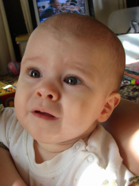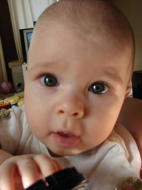 Во, у нас такое же выражение лица когда фотик не даешь малышке.... сначала буря радости - типа, мама мне новую игруху достала! - а потом вот так кукситься начинает, а то и в рев. Оль, ты просто герой,у меня давно уже крупных планов не получается... прям хоть во сне подкрадывайся...