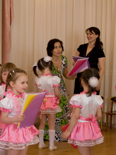 Костюмы правда те же были, что и на 8 марта, но у девочек был номер, где одна часть девчек была бабочками (с симпатишными мохнатенькими крылышками), а другая часть цветочками (большие такие штуки в виде цветов водрузили на голову).. типа бабочки летят на цветочки.. Под конец вручили дипломы с характеристикой наших чад, некоторыми их работами, которые родители не успели утащить домой и т.д. Не поленюсь, щас процитирую несколько строк: Кем я хочу быть: "Когда я вырасту, я стану художником, а иногда буду в космос летать. Буду еще воспитывать деток, буду наверное кормить корову .. Хочу чтобы мы никогда не голодали ![]() , но только не есть рисовую кашу! Еще, может быть, управлять автобусом.. или метро.." Вот такие вот желания.. ![]() Повешу несколько фоточек. На последней.. Мальчик (смотрит в кадр), который нравится Поле, и которая нравится ему. Сегодня только узнала про всю эту историю.. После долгих распросов Поля призналась, что Максим ей сказал следующее: "Ты моя прекрасная зездочка, малышка, бабочка.. "![]() А еще что он сказал? - поитересовалась я.. "Ой, мам, ну хватит тебе расспрашивать.. сказал - будем жениться, и все тут!" ![]() ![]() |