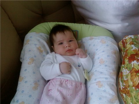 Всем приветик!! Вы нас уже наверное потеряли и забыли. А мы лето провели на даче, а сейчас постоянно в разъездах, то к бабушке( к свекрови) в гости, по для собеса собираем бумажки. Хотим оформиться как малоимущие (мухлюем) =))). А мы уже большие, ползаем на пузе, зубов нет и я рада, не хочу чтобы рано вылезли. сами не садимся, но если посадят, сидеть любим. А ещё мы любим играть в прятки, грызть ложки и рвать газеты. Вот мы какие, для Иришки, сейчас мы весим 7500 и 65см.