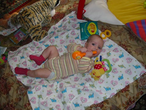 Такая погода классная Сегодня большую часть дня на улице торчали Смотрели на птичек, собачек, лошадок и пони ![]() Покажу пару фоток: Жуем погремушку (зубы чешееееет!) Пьем водичку Жуем пальцы ![]() |