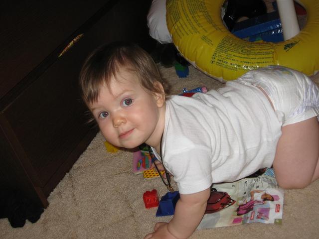 Вчера вообще прикольно было - я ее в ванной на коврике оставила и пошла дверь на ключ закрывать. Влада выползла в коридор, ползет в прихожую ко мне, там естесственно не очень чисто. Я говорю, Владушка, сюда нельзя, ползи обратно в ванную, купаться. Ребенок разворачивается и ползет в ванную, заползает и садится на коврик. Мама в шоке.