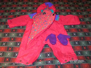 1. желтые КОЛГОТКИ, не чистый хлопок, рост примерно 74-80; теплый СВИТЕР оранжевый с зеленым с отложным воротничком. 2. теплые ШТАНЫ малинового цвета, рост 81-86 см, 1-1,5 г. Украшения - спереди три пуговички, сзади аппликация-мишка. 3. Вельветовые изумрудно-зеленые БРЮЧКИ, широкий пояс, книзу суживаются, рост 74, 1 год. На девочку. 4. К ним мы носили зеленую КОФТОЧКУ на кнопках, с капюшоном, отделка - красная клетчатая. Тоже на девочку. |