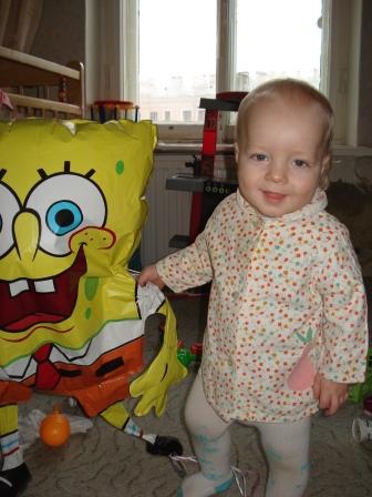 вот наш новый дружбан. В основном он под потолком болтается, Славка его периодически дёргает за верёвочку. А когда спускаю, то начинается веселуха. Славка бегает с ним, падает на него, хохочет, за руки-ноги дёргает.
