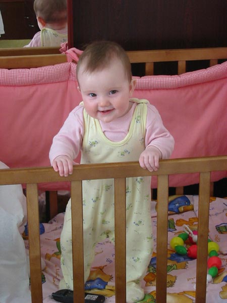 Рост-70 см, вес-8590 г, зубов-7. За этот месяц Рита многому научилась-научилась ползать, сидеть, садиться с четверенек, вставать в кроватке, играть в "ладушки" и махать ручкой. Пополнилась наша копилка зубов-теперь их 7 Гуляем в прогулочной коляске. Не скажу, что дочь от нее в восторге, но при лучших раскладах может поспать часа полтора. Просто кататься быстро надоедает и начинает капризить. А на площадку нам еще рановато. Едим овощи (из банок и домашние)-брокколи, цветную капусту, картофель, тыкву, кукурузу, кабачок. Каши домашние-гречу, овсяную, рисовую с добавлением фруктов. Еще едим всякие фруктовые баночки и простые яблоки и груши. Еще едим "Агушу" через день. Каши и овощей-максимум 100-120 грамм. Едим с переменным успехом, вообще не очень любим это дело. Лучший друг-по прежнему сися. Особенно ночью. Посему спим по-прежнему с мамой. Теперь попробую немного фоток приложить. |