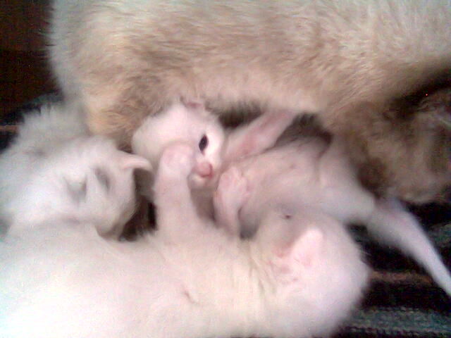 Белые коты - это прелесть! А мама у них какая: сиамская или невская маскарадная (там на фотографии только бочок ее виден)?