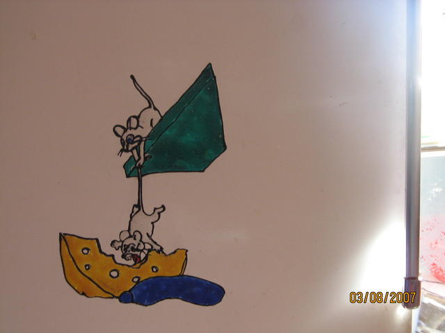 Мыши на холодильник. Это витражные краски. Дочкам мазала те куски, где много одного цвета. Сосиська ( синяя), сыр и чуть-чуть мышей. Главная задача была - попасть в контур. Мелкие детали , конечно, рисовала я. Работа усложнилась из-за того, что краски в тюбике. Пугало. Ну, конечно, дочка собирала колоски. Еще она клеила на основу детали из ткани. Сначала потренировались на бумаге, а потом уже ткань пошла в дело. |