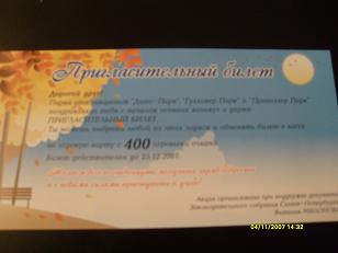 Нам опустили в почтовый ящик.Консьержка сказала,что ей дали для тех у кого есть дети и она опустила к нам в почтоаый ящик.Написано что до 25.12.2007 года этот пригласительный билет можно обменять в перечисленных парках на игровую карту с 400 очками.Акция проводится при поддержке депутата Виталия Милонова. Не знаю ехать или нет?Может кто-нибудь уже был? |