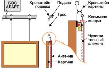 у меня отец свои работы вывешивал так: к бордюру - у нас он от потолка ниже см на 30-50 (или можно под потолком) вкручикал маленький винтик (ну чтоб шляпка не заметная была). смысл такой что прекрепляется картина к леске, которую не видно на обоях, а винтик за который вешается леска высоко, так на него и внимания не обращаешь. тем более что при желании высоту подвеса регулировать можно.