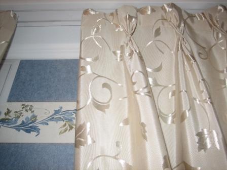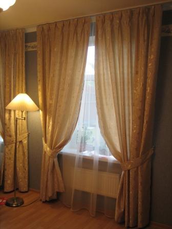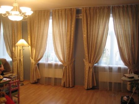 Вот собственно творение девочек с форума. Было три окна, в ряд, долго думали насчет цвета, муж уговаривал в тон, голубенькие, а я настояла на своем, выбрала сливочный цвет, фактрура очень приятная у портьер, плюс легкая органза. Может кому пригодится как идея.