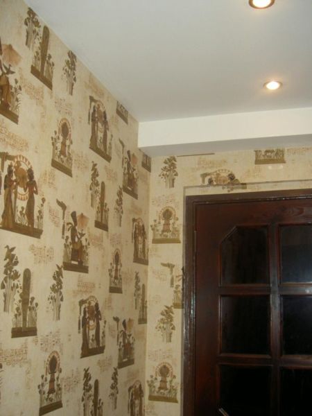 ). Потолок в ванной и туалете - навесной из пластиковых широких рей (не знаю, как эти штуки правильно называются , укладываются, как ламинат или вагонка), на стенах и полу - плитка; в прихожей - навесной потолок из гипрока, стены - обои, на полу - плитка "под ламинат". Собственно и все. . Пелястры в коридоре сделаны т.к. были углы от несущих стен. |