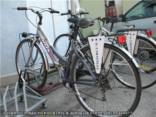 http://www.hotel-caravelle.it/hotel/index.php?action=HOMEMOD&parsezione=2 В отеле 16 этажей, ресторан на 2-м этаже, уютный холл, 3 лифта (но до последних этажей сложно добираться, приходится долго ждать), открытая терасса, фонтан, живая музыка, дискотеки. В отеле дают велосипеды под залог – 10 евро на день. Вечером использовать велосипеды нельзя. Номера не очень большие, но уютные Стандартная комната: 2 кровати, маленький телевизор, много шкафов, 2 тумбочки, кресло (которое разбирается, используется для дополнительного спального места), стол, стул Ванная: душевая кабина, туалет, зеркало, все принадлежности для принятия душа, фен Еда в ресторане при отеле: завтрак – холодный, яйца, ветчина, колбаса, круасаны, булочки, джемы, масло, йогурты, мюсли, кофе, соки, чай; ужин – много блюд из макарон, морепродукты, фрукты. |