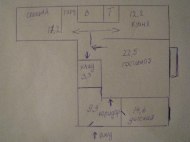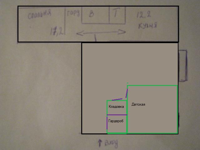 Доброго вечера. У меня вот возникла такая проблема. Я уже на форуме просила совета, но тема быстро сошла на нет. Хотела бы еще раз услашать Ваше мнение и Ваши советы. Вот план моей квартиры. Квартира неплохая, но мне нужна перепланировка. Что именно здесь не нравится: на схеме я это плохо прорисовала, но сразу после входа в квартиру, справа дверь в комнату ребенка. Она очень долго засыпает и достаточно чутко спит. Поэтому постоянные проблемы, пока ребенок засыпает не зайти, не выйти из квартиру, гостей не пустить, не выпустить, домофон звонит, ребенок просыпается. Да и вообще подобное расположение, как то неуютно что-ли.